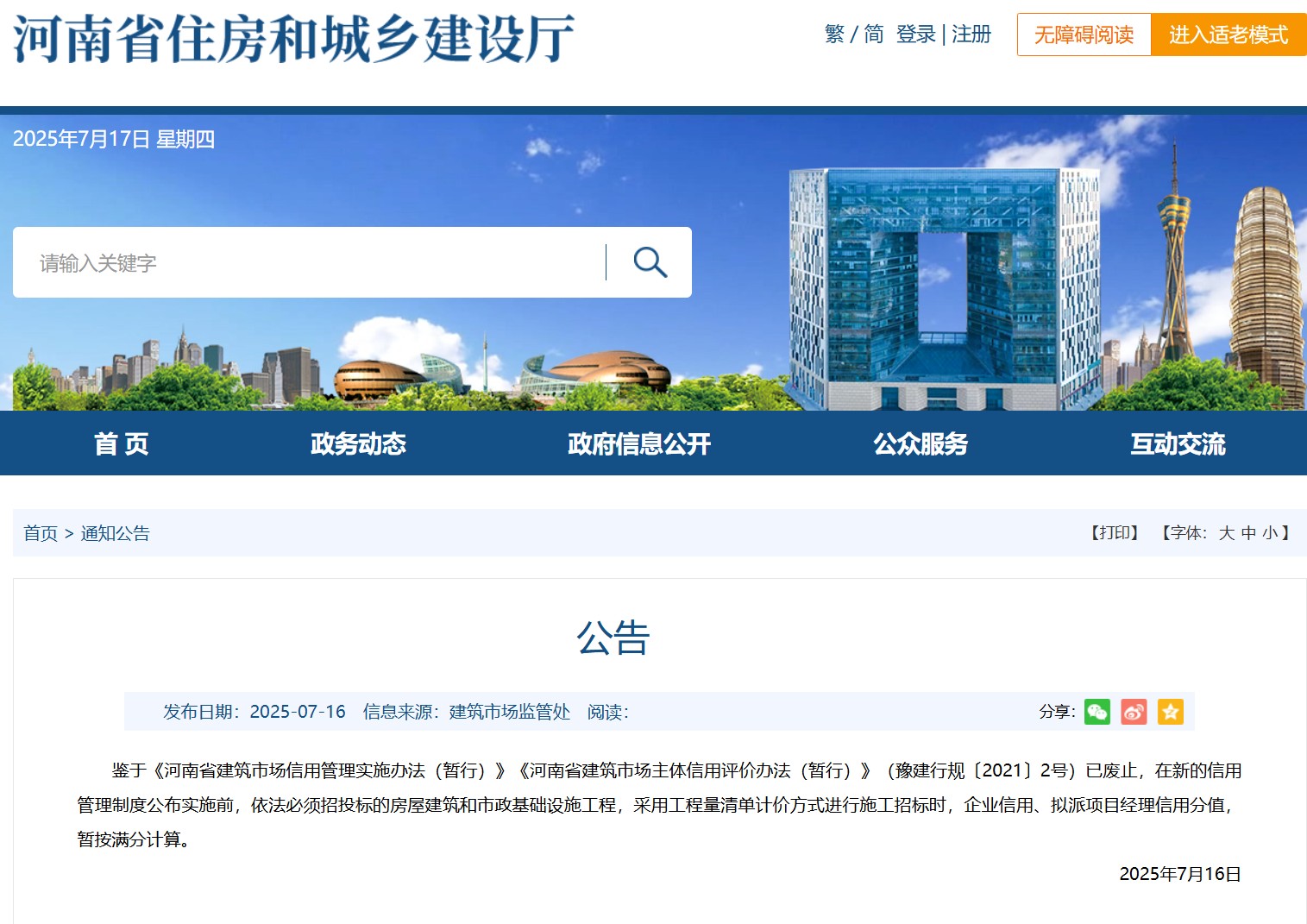 河南省住建廳發(fā)布關(guān)于房建、市政施工項目招標(biāo)時信用分計算的公告
